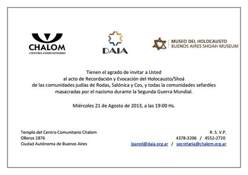 La DAIA, Chalom y el Museo del Holocausto de Buenos Aires invitan al Acto de Recordación y Evocación del Holocausto/Shoá de las comunidades judías de Rodas, Salónica y Cos, y todas las comunidades sefaradíes masacradas por el nazismo durante la Segunda Guerra Mundial a realizarse el próximo Miércoles 21 de agosto, a las 19, en … Leer más