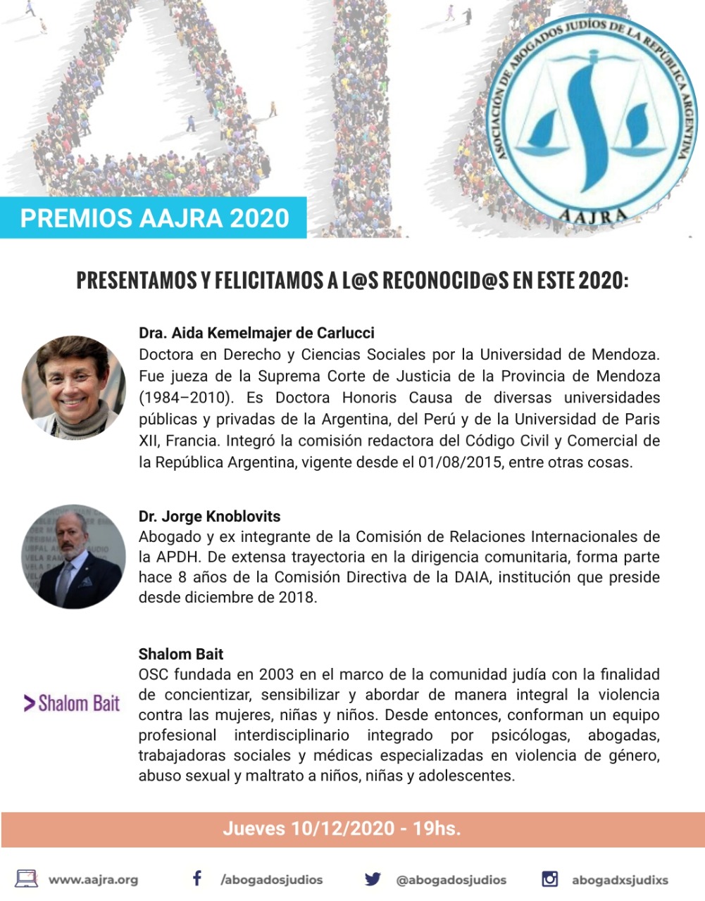 La Asociación de Abogados Judíos de la República Argentina (AAJRA) otorgará un reconocimiento al presidente de la DAIA, Jorge Knoblovits, por su «extensa trayectoria en la dirigencia comunitaria». La premiación tendrá lugar el jueves 10 de diciembre a las 19. Junto al titular de la DAIA, será galardonada la Dra. Aida Kemelmajer de Carlucci, Doctora en Derecho … Leer más