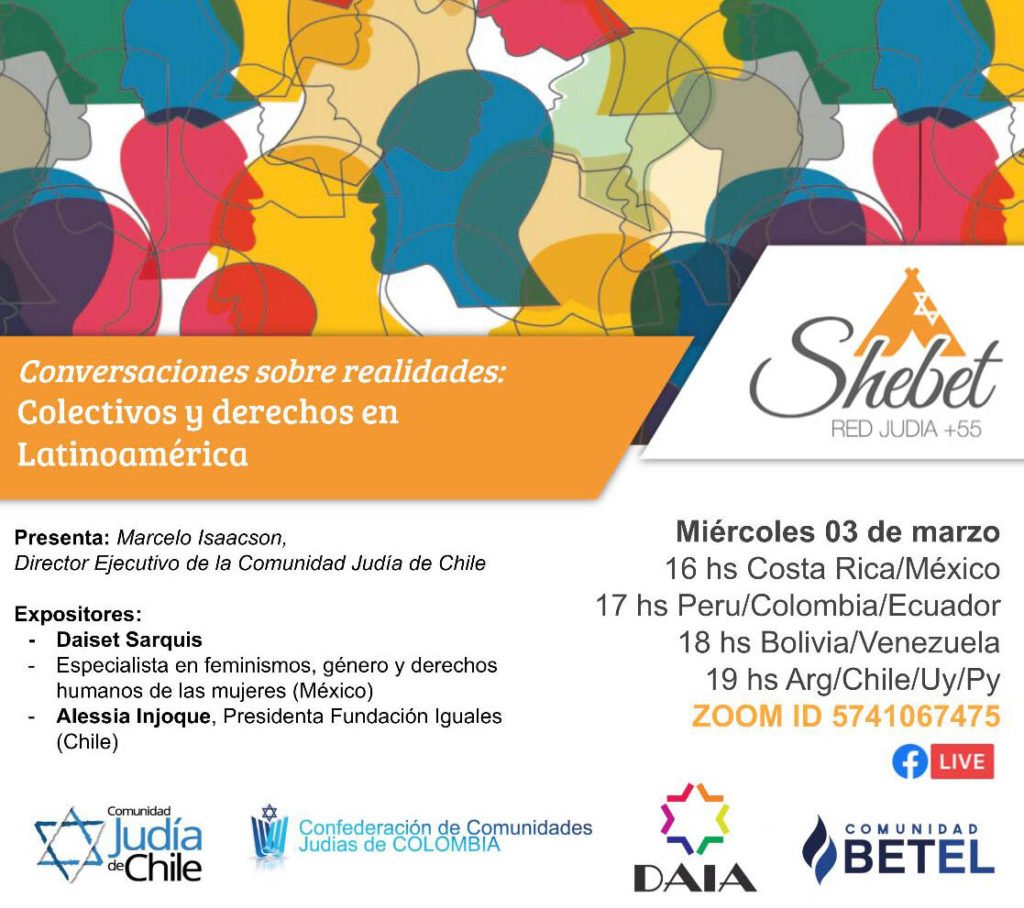 La DAIA se unió a la Red Judía Shebet, la Comunidad Judía de Chile, la Confederación de Comunidades Judías de Colombia, y la comunidad Betel, para presentar la conferencia virtual «Conversaciones sobre realidades: Colectivos y derechos en Latinoamérica». La charla tendrá lugar el miércoles 3 de marzo a las 19 (hora de la Argentina) y se podrá ver a través de Zoom. Los disertantes serán la especialista en feminismos, género y derechos humanos de las mujeres (México), Daiset Sarquis; y la presidenta de la Fundación Iguales (Chile), Alessia Injoque.
