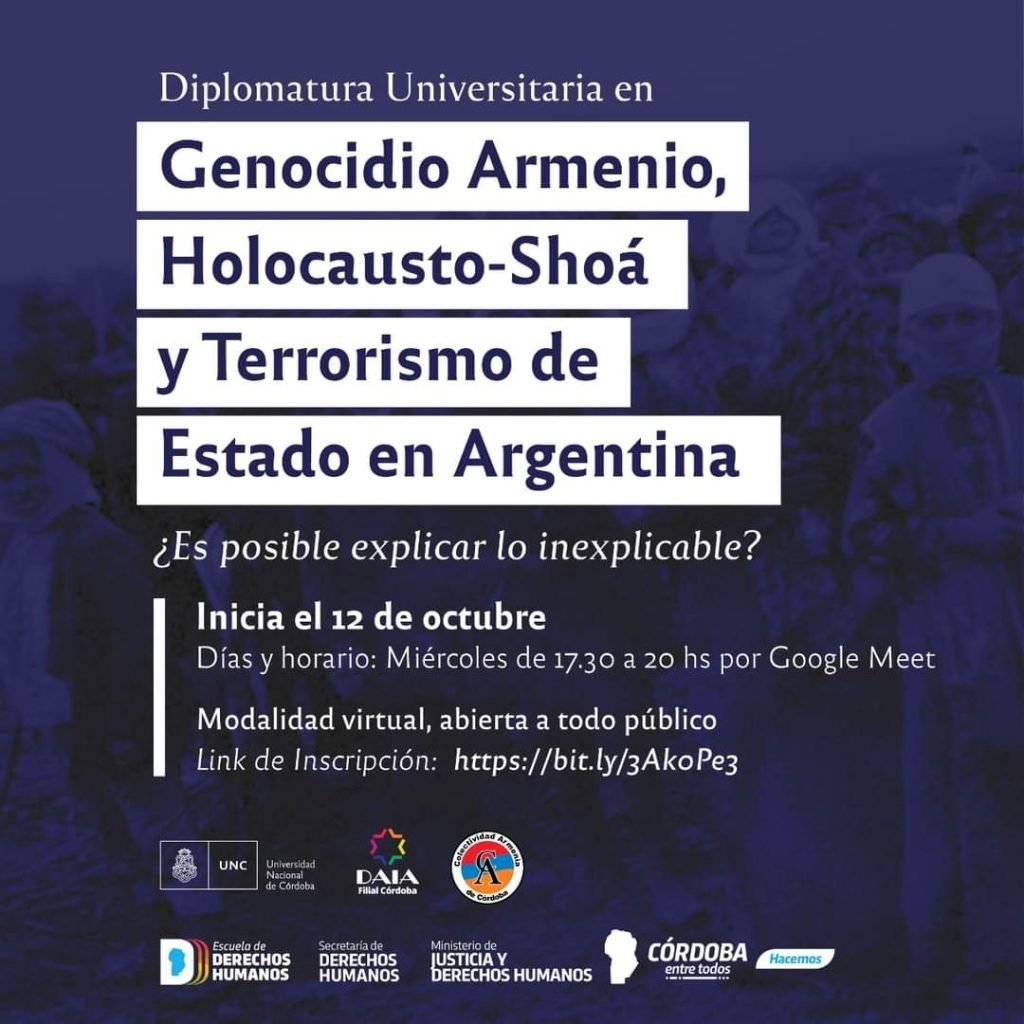 La DAIA Filial Córdoba invita a la Diplomatura Universitaria en Genocidio Armenio, Holocausto-Shoá y Terrorismo de Estado en Argentina que se desarrollará junto a la UNC, la Colectividad Armenia y el Ministerio de Justicia y Derechos Humanos de Córdoba.